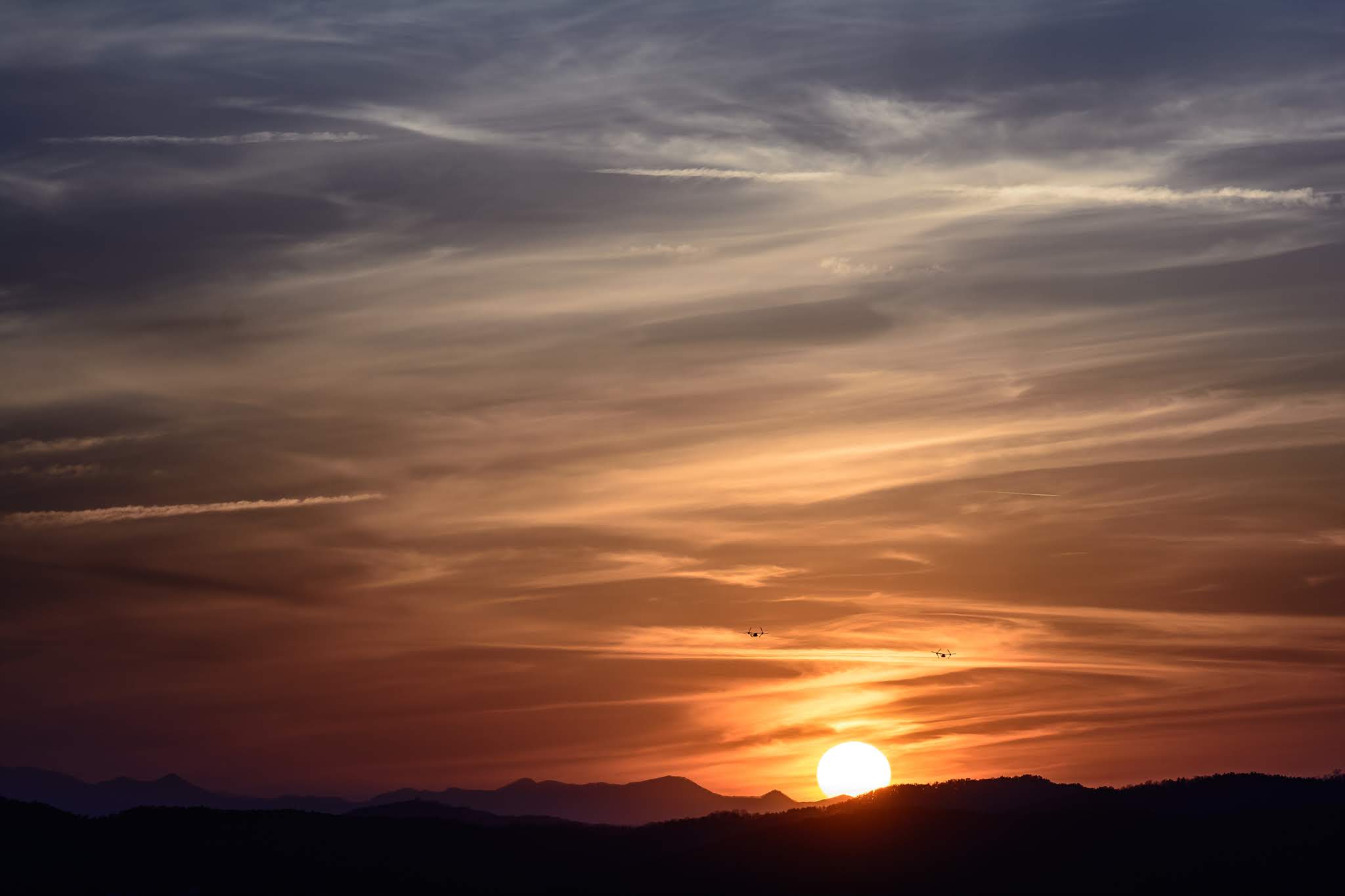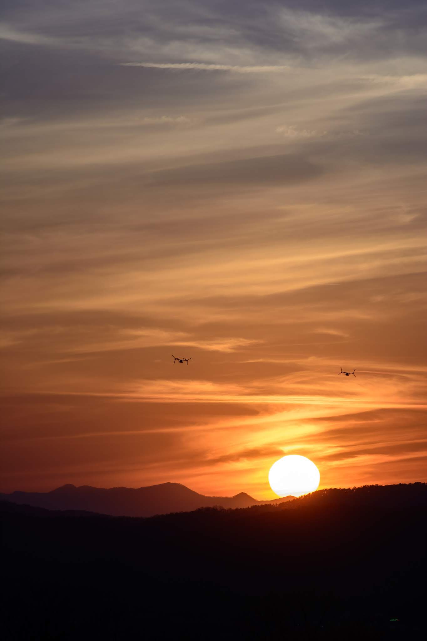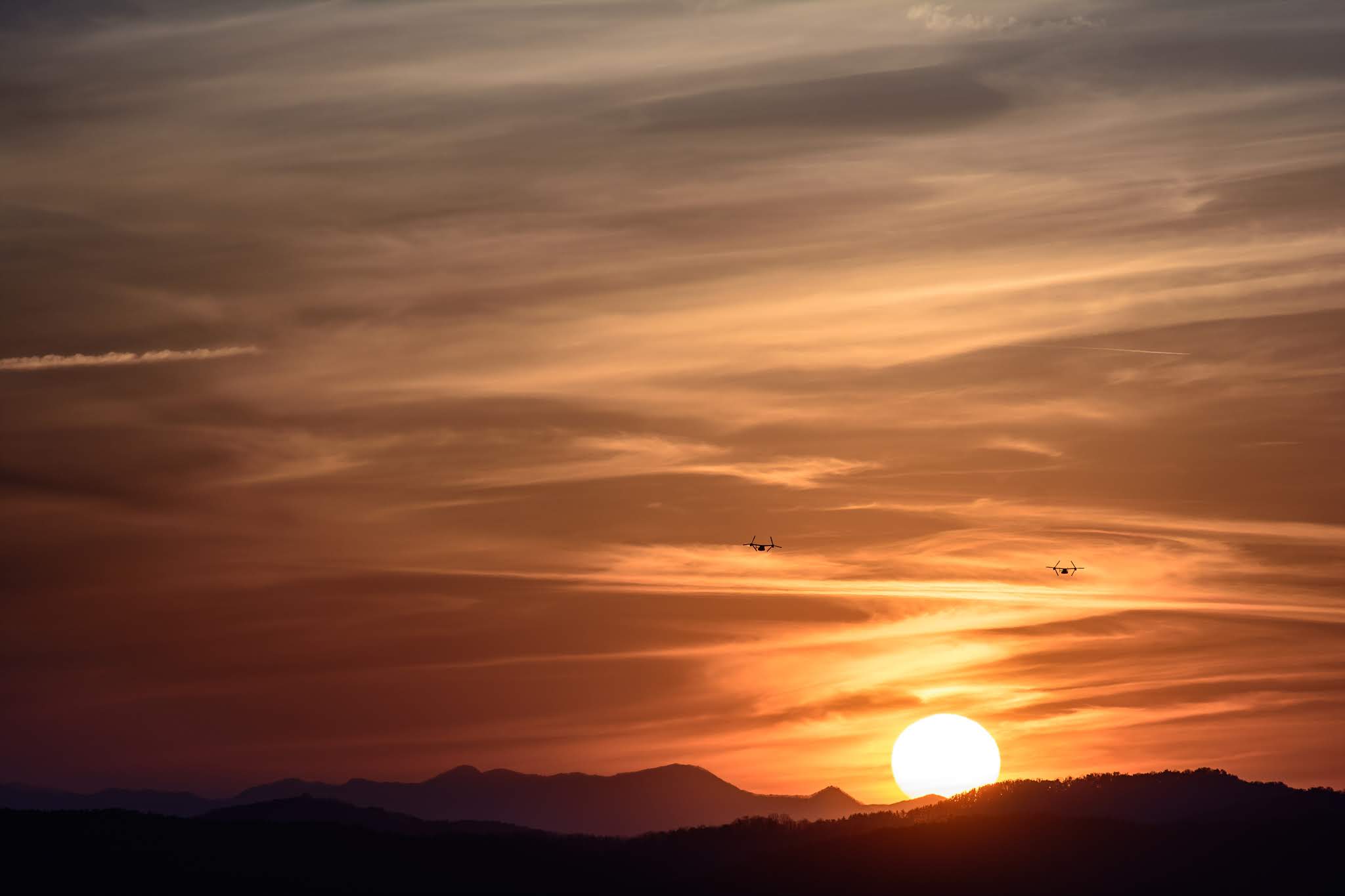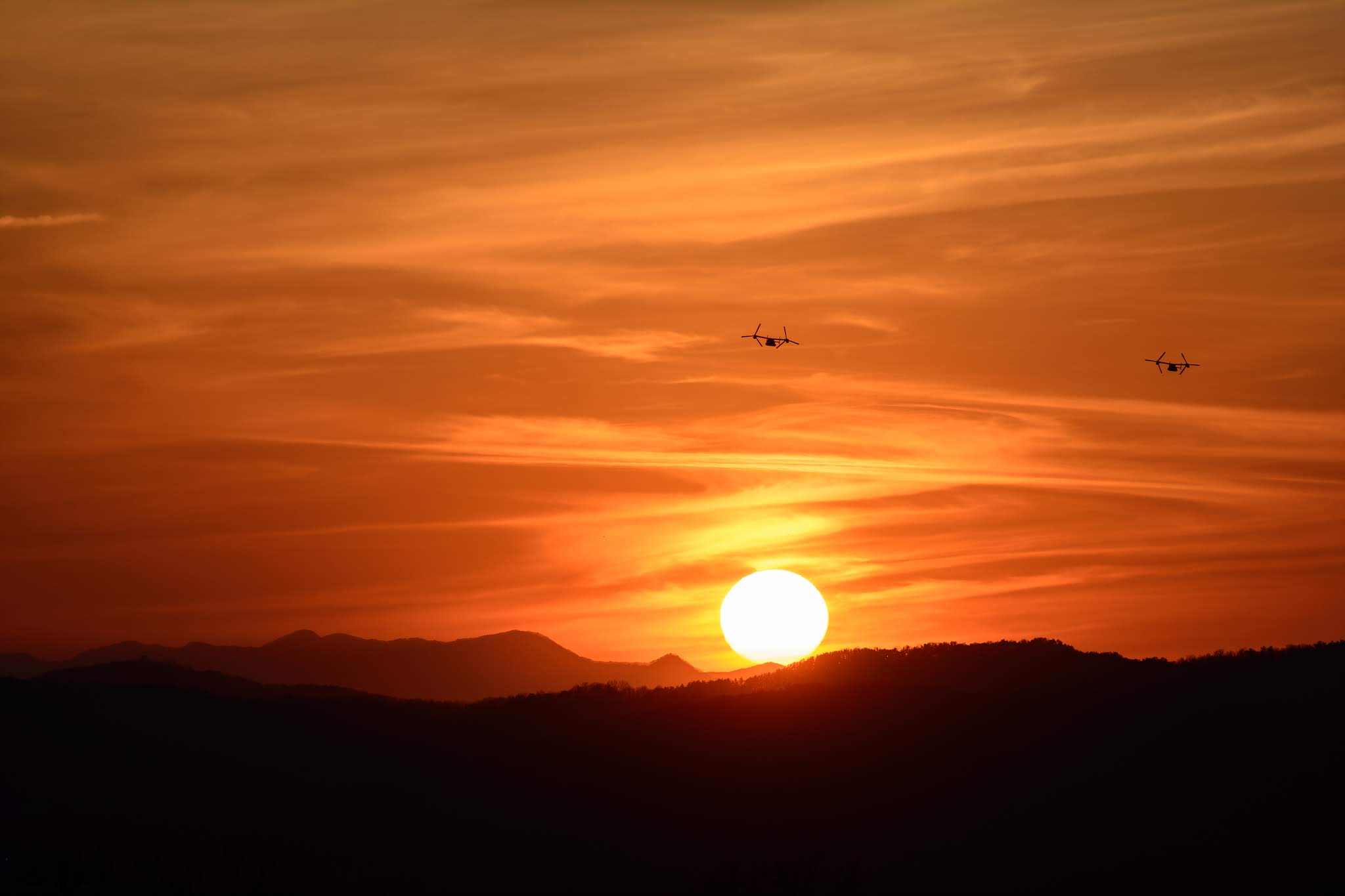 처음 보는 형태의 비행기 두대가 석양을 향해 달려준다.